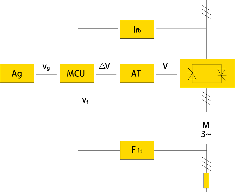 閉環控制的原理見圖,圖中 Ag 為主令給定,Ffb 為轉子頻率反饋,Ifb 為電流反饋,MCU 為微處理器,AT 為移相觸發器,△V =vg - vf。當△V>0時,PID控制輸出V增加,晶閘管導通角增加,定子電壓升高,電機加速;當△V<0時,V減小,晶閘管導通角減小,定子電壓降低,電機減速;當△V=0時,V不變,晶閘管導通角不變,定子電壓不變,電機穩定運行。 電機剛啟動時,轉子頻率高,vf低,△V>0,電機在較高的電壓下啟動,隨著電機加速,轉子頻率下降,Vf增加,逐漸接近vg,當△V=0,電機穩速運行,此時電機轉矩和負載轉矩相平衡。因某種原因,如速度給定改變,或負載改變打破了原平衡,系統將根據上述原理自動趨向新的平衡。 | ![]() |